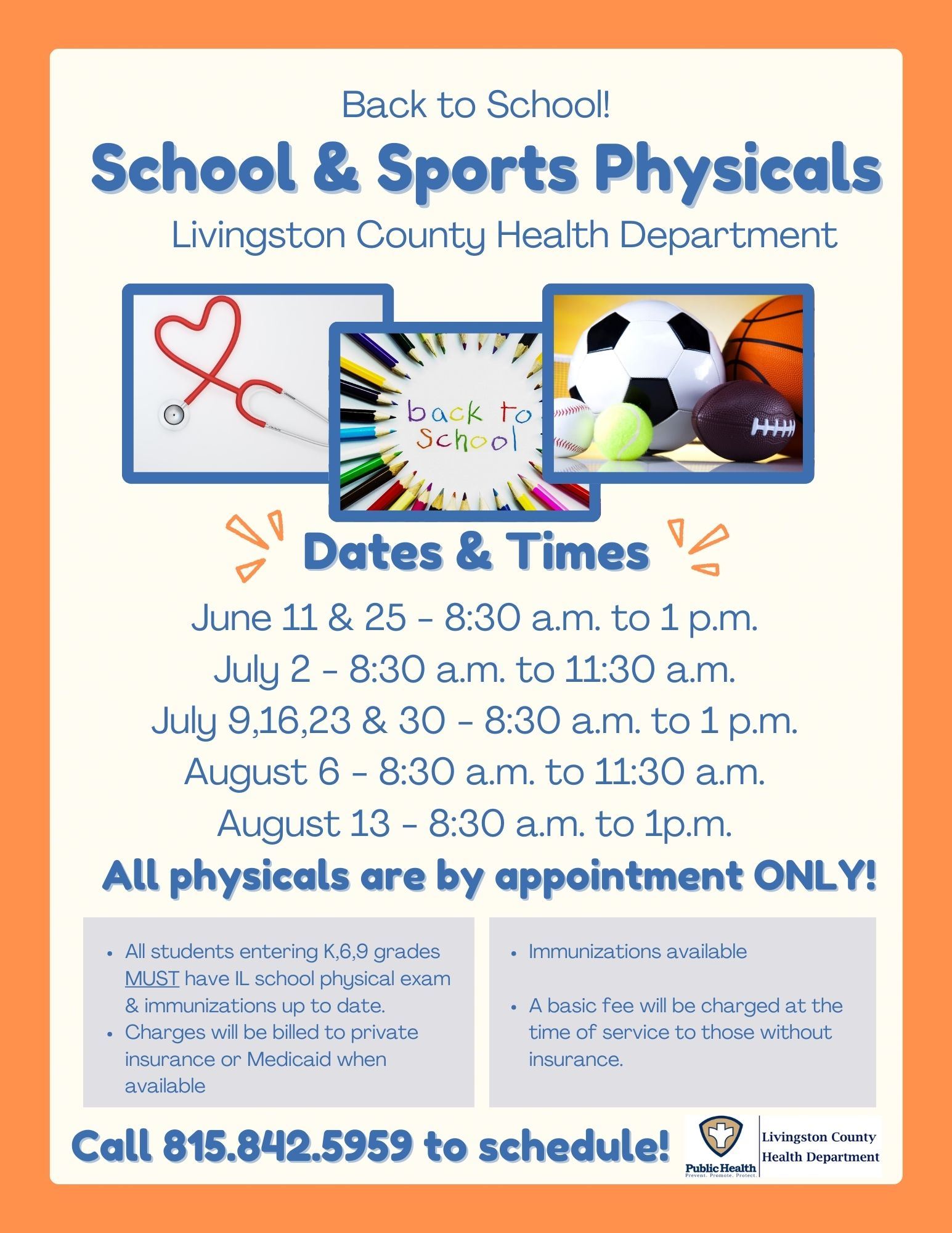 Physicals and immunizations are scheduled each summer. To schedule an appointment for the school year, please call the Livingston County Health Department at (815) 844-7174